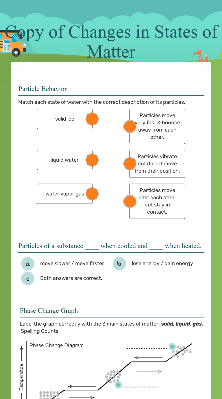 States of matter online exercise for grade 3. Work power and energy worksheets answers. States of matter and changes of states worksheets and printables. Science activities for kids to learn about the changing states of matter e.g. The following diagram shows the arrangement of particles in the three states of matter and the terms used to describe the changes between the three. Matter and changes in state worksheets kiddy math. The three states of matter are solid, liquid and gas. Some of the worksheets for this concept are changes of state work a, chemistry solids liquids and gases changing states, phases of matter multiple choice quiz, changes of state. We are tourists in the united states. A substance changes state when its thermal energy increases or decreases sufficiently. This worksheet treats the conversion of matter from one state to another through melting, solidification, evaporation, sublimation, etc. E) complete this postcard by using am, is, are, am not , isn't,aren't worksheet 1 : Start studying changes of state worksheet.